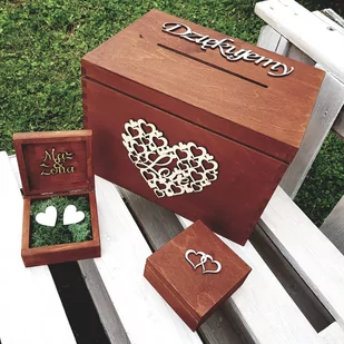 KOMPLET PUDEŁKO NA KOPERTY + PUDEŁKO NA OBRĄCZKI Zestaw zawiera: Pudełko na obrączki ślubne Materiał: drewno Wymiary: 10 x 10 x 5 cm Pudełko zawiera: Dekor ze sklejki brzozowej górny w kolorze naturalnym Dekor ze sklejki brzozowej dolny w kolorze naturalnym Mech reniferowy / sianko Dwa serduszka z mniejszymi serduszkami do podtrzymania obrączek Pudełko na koperty ślubne Materiał: