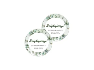 Naklejki personalizowane w motywie eukaliptusa jako podziękowania za obecność na weselu. Można nakleić na różne prezenty dla gości.
