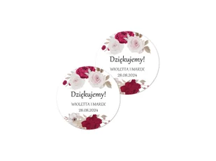 Naklejki personalizowane w motywie kwiatowym z różami jako podziękowania za obecność na weselu. Można nakleić na różne prezenty dla gości.
