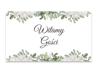 Papierowy plakat jednostronny w motywie białych kwiatów z napisem Witamy Gości.