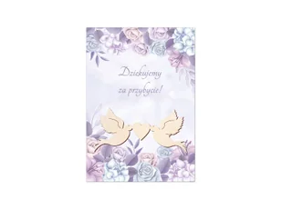 Podziękowanie dla gości weselnych z gołąbkami w motywie lawendowym. Wymiary kartki: 7 cm x 10 cm. Wymiary gołąbków: 6 cm x 3 cm. Opakowanie: 1 szt.