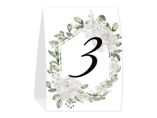 Papierowa dekoracja z cyfrą do oznaczenia stołów weselnych w motywie białych kwiatów.