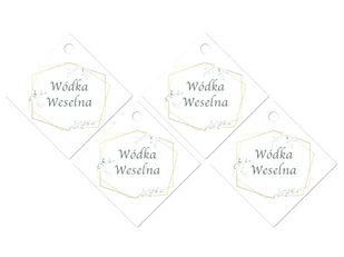 Papierowa zawieszki z wstążeczką na butelkę z napisem Wódka Weselna.