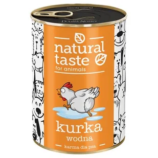 Karma dla psa Natural Taste Kurka Wodna to produkt lekkostrawny, idealnie dopasowany do wymogów żywienia dorosłych psów, zawierający witaminy i minerały. Karma wzbogacona została o dodatek oleju lnianego, który bierze udział w wygaszaniu stanów zapalnych. Skład: kurczak 26% (serca, żołądki, mięso, wątroba), wieprzowina 26% (wątroba, płuca, nerki, mięso, przełyki), rosół, wołowina 15% (płuca, żołądki), substancje mineralne, olej lniany 0,2%. Składniki analityczne: białko surowe – 10%, tłuszcz surowy – 6%, popiół surowy – 2,5%, włókno surowe – 0,6%, wilgotność – 78%, wapń – 0,3%, fosfor – 0,25%.