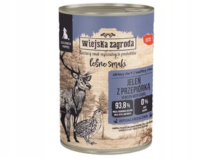 Wiejska Zagroda Leśne Smaki Jeleń z przepiórką to bezzbożowa, pełnoporcjowa karma mokra dla szczeniąt, oparta na jeleniu i przepiórce z dodatkiem jagód oraz ziół. Wysoka zawartość mięsa, podrobów i bulionu wspiera zdrowy start młodego psa.