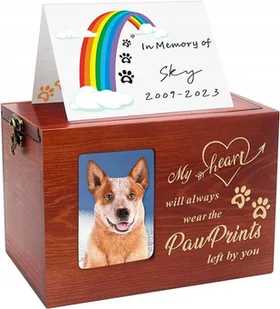 Ta starannie wykonana drewniana urna na prochy dla psa to wyjątkowa pamiątka, która pozwala godnie uczcić pamięć ukochanego pupila. Solidna konstrukcja z drewna nadaje jej elegancki wygląd, a na froncie znajduje się ramka na zdjęcie, w której można umieścić fotografię zwierzaka. Ozdobny grawer z sercem i łapkami podkreśla emocjonalną wartość urny. Pojemność 1 L sprawia, że jest odpowiednia dla małych i średnich psów. Zamykana na metalowy zatrzask, gwarantuje bezpieczeństwo przechowywania.