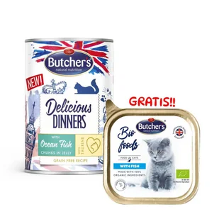 BUTCHER'S Delicious Dinners z rybą morską kawałki w galaretce 400g (kot) + Bio Food Cat z rybą 85g GRATIS!!