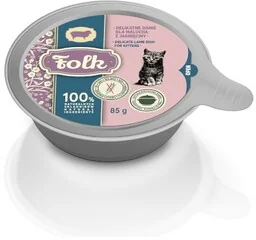 FOLK Delikatne danie dla malucha z jagnięciny to pełnoporcjowa karma mokra dla kociąt i kotek ciężarnych oraz karmiących. Karma zapewnia rozwijającemu się organizmowi młodego kotka odpowiednią ilość energii, a jego karmiącej mamie zapewnia wszelkie niezbędne składniki odżywcze i witaminy. Bezzbożowa receptura bazuje na mięsie z wyjątkowo delikatnej jagnięciny. Skład: jagnięcina 75 % (mięso jagnięce, wątroba), bulion, olej z łososia 0,3%, substancje mineralne.