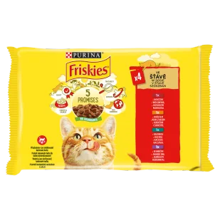 FRISKIES – mokra karma dla kota 4 smaki mięsne w sosie 4×85 g. Pełnoporcjowe saszetki dla dorosłych kotów w czterech mięsnych smakach. Soczyste kawałki w sosie zapewniają wysoką smakowitość i dodatkową porcję wody w diecie. Jednostkowe porcje 85 g są wygodne do podawania – na jeden świeży posiłek, bez resztek.