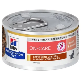 Pełnoporcjowa dietetyczna karma dla dorosłych kotów HILL'S On Care wspomagająca odżywianie podczas rekonwalescencji. Ta karma ma wysoką gęstość energetyczną, wysokie stężenie niezbędnych składników odżywczych i lekkostrawnych składników. Specjaliści żywienia i lekarze weterynarii Hill's opracowali skład Hill's On Care specjalnie tak, aby wspomagać żywienie i wspieranie kotów zmagających się z poważną chorobą. Ta pyszna mokra karma zawiera kurczaka i warzywa, aromatyczne tłuszcze i wysoce strawne białko, aby zapewnić Twojemu kotu doskonałe wrażenia z posiłku. Opakowanie puszka 82 g.