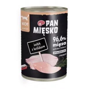 KARMA PEŁNOPORCJOWA MOKRA DLA KOTÓW DOROSŁYCHZ dodatkiem tymianku. 96,7% mięsa, podrobów i bulionu. Wyprodukowana w Polsce!Poznaj wysokomięsne karmy mokre dla kotów Pan Mięsko. Wyróżniają je starannie wyselekcjonowane mięsa z dodatkiem soczystych polskich jabłek i cennych dodatków, jak zioła czy nasiona, które pozytywnie wpłyną na zdrowie oraz kondycję Twojego kota. Nasze receptury zostały przygotowane przez specjalistów, po to, aby dostarczyć Twojemu czworonożnemu towarzyszowi dokładnie to, czego potrzebuje.