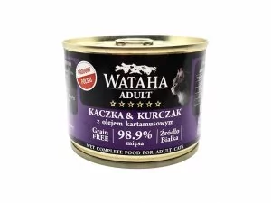 Mokra karma Wataha Hunt Kaczka i Kurczak dla dorosłych kotów różnych ras. Karma z wysoką zawartością mięsa drobiowego i dodatkiem oleju kartamusowego. Forma miękkiego pasztetu jest niezwykle delikatna, ułatwia rozdrabnianie i przełykanie. Karma charakteryzuje się wysoką wilgotnością, dzięki czemu może stanowić dodatkowe źródło nawodnienia. Produkt powstał w zgodzie z naturą i z myślą o kocich potrzebach żywieniowych.