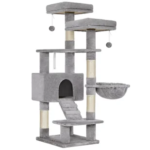 Solidny i stabilny drapak widokowy wykonany z płyty MDF z 2 podwyższonymi platformami, rampą prowadzącą do przytulnej jaskini, miękkim koszem i słupkami owiniętymi sizalem do drapania