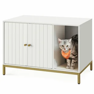 Innowacyjna obudowana kuweta ukryta w biało-złotej szafce z małą matą do drapania na wejściu, obszerny blat może posłużyć dodatkowo jako stolik kawowy lub szafka pod telewizor