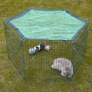 Siatka zagrodowa w kształcie sześciokąta (ZB009778) zapewnia zwierzętom cień, zapobiega ich ucieczce z zagrody i chroni je przed drapieżnikami. Wymiary: Ø 108 cm bok ok. 60 cm Kolor: Zielony Siatka zabezpieczająca do 6-elementowych obudów zewnętrznych. (np. obudowa zewnętrzna Kerbl SAFARI z sześcioma elementami bocznymi. sześciu elementów (każdy o długości 60 cm).Kolor: zielony, czarny