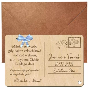 DREWNIANA KARTKA POCZTOWA EKO ŻYCZENIA NA ŚLUB WESELE Przedstawiamy wyjątkową, piękną drewnianą kartkę pocztową z życzeniami. Kartka o grubości 3mm oraz wymiarach 14,5 x 9,5 cm (szer x wys). Nadruk wykonujemy techniką laserową, co daje niepowtarzalny efekt końcowy. Wspaniały, oryginalny upominek dla bliskiej osoby lub osób.