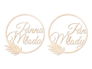 Duże obręcze z napisami Panna Młoda i Pan Młody oraz listkami.