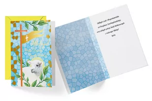 Karnet wielkanocny, posiada delikatne złote zdobienia. Kartka posiada tekst w środku, dołączona jest do niej koperta.