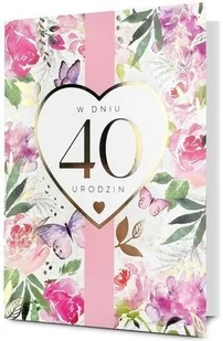 Karnet B6 Urodziny 40. Artykuł papierniczy. Kartka jest zdobiona połyskującą folią UV, zawiera życzenia oraz kolorowy środek W zestawie znajduje się koperta, kolorystycznie uzupełniająca się z kartką Format złożonej kartki: B6
