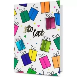 Kartka jest bogato i różnorodnie zdobiona.Kartka zawiera życzenia i kolorowy środek.W zestawie znajduje się koperta, kolorystycznie uzupełniająca się z kartką.