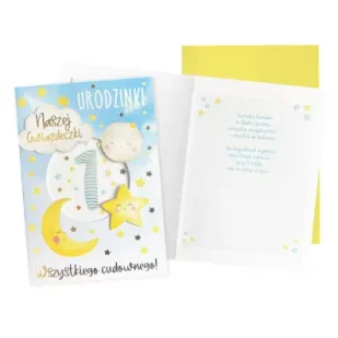 Kartka B6 z ozdobnej serii Dream Cards na 1 urodziny - nieduża, ale robi wrażenie dzięki atrakcyjnej kolorystyce i ciekawym zdobieniom. To idealny wybór łączący przyjazną cenę z jakością. Cechy szczególne: wielkość: B6, 16. 6 x 11. 7 cm po złożeniu,koperta: w zestawie, kolorowa,zdobienia: