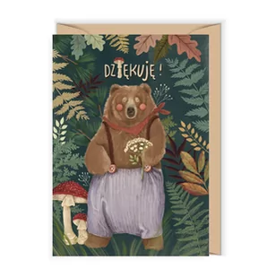Karnet Dziękuję z misiem wymiar 120x170 mm po zgięciu karnet pusty w środku z miejscem na Twoje życzenia wykonany we Wrocławiu przez Cudowianki drukowany na papierze ekologicznym, z wyraźnie widoczną fakturką w zestawie eko koperta