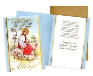 Karnet PP-2254 Wielkanoc Kartka wielkości B6, zdobiona w zależności od wzoru metaliczną folią lub brokatem. Każda kartka posiada kolorowe życzenia w środku i kopertę. Wymiary karnetu po złożeniu: 11,7 x 16,6 cm.