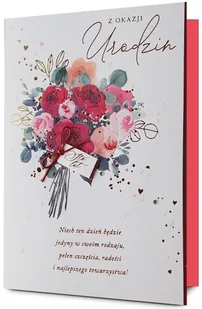 Karnet Urodziny. Artykuł papierniczy. Kartka jest bogato i różnorodnie zdobiona (zależnie od wzoru: metaliczna folia, lakier perłowy, brokat, przyklejone elementy 3d - wypukłe wstawki papierowe, elementy biżuteryjne, tłoczenia)Kartka zawiera życzenia i kolorowy środek W zestawie znajduje się. . .