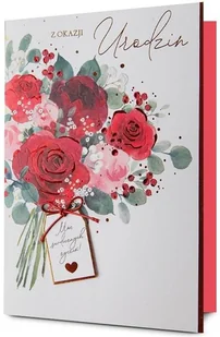 Karnet Urodziny. Artykuł papierniczy. Kartka jest bogato i różnorodnie zdobiona (zależnie od wzoru: metaliczna folia, lakier perłowy, brokat, przyklejone elementy 3d - wypukłe wstawki papierowe, elementy biżuteryjne, tłoczenia)Kartka zawiera życzenia i kolorowy środek W zestawie znajduje się. . .