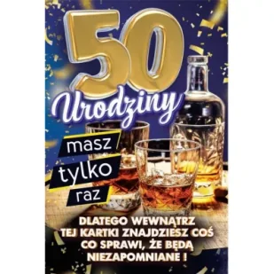 Karnet JCX z nakładką na butelkę to wyjątkowy pomysł na sprawienie obdarowanemu nim wesołej i niebanalnej niespodzianki. Wykonane z wysokiej jakości grubego papieru o gramaturze 350g i uszlachetnione lakierem UV. Wewnątrz karnetu znajduje się dedykowana nakładka na butelkę, którą można powiesić na butelkę dowolnego napoju. Nakładka jest wykonana z grubego, klejonego papieru, ozdobiona złoceniami. Oryginalne i wesołe teksty zaskoczą każdego jubilata i z pewnością wywołają uśmiech na jego twarzy.