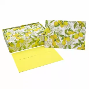 Kolekcja eleganckich karnetów marki Peter Pauper Press – Cytryny z Amalfi (Amalfi Lemons). Każda kartka posiada zdobienia ze złotej folii i dopasowaną kolorystycznie kopertę, wszystko wykonane z papieru z certyfikatem FSC. Całość została zapakowana w ozdobne pudełko z identycznym wzorem. Uniwersalna otwierana kartka okolicznościowa z pustym środkiem pozwala na pełną personalizację i stworzenie wyjątkowej pamiątki dla obdarowanej osoby. W skład zestawu wchodzą: