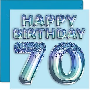 Kartka na 70. urodziny dla mężczyzn - niebieski brokatowy balon imprezowy - kartki urodzinowe dla 70-letniego mężczyzny pradziadka dziadka taty babci, 145 mm x 145 mm siedemdziesiąte siedemdziesiąte