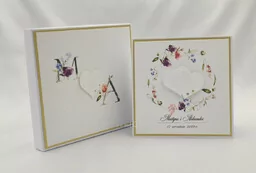 Elegancka, ręcznie wykonana kartka z okazji ślubu w pudełku z ozdobnąkopertą na pieniądze, voucher podarunkowy lub drobny upominek. Zestaw z delikatną, kwiatową grafiką i subtelnym dekorem. W środku kunsztownie wykończonego pudełka znajduje się miejsce na pieniądze, voucher prezentowy lub drobną biżuterię. W środku kartki jest miejsce na personalne życzenia dla młodej pary. Kartka o wymiarze 14x14 cm otwiera się ku górze, w skład zestawuwchodzi pudełko, ozdobna kartka z życzeniami oraz dekoracyjna koperta(handmade).