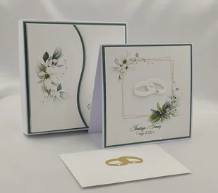 Elegancka, ręcznie wykonana kartka z okazji ślubu w pudełku z ozdobną kopertą na drobny upominek lub pieniądze. Zestaw z kwiatową grafiką i ręcznie wyciętym dekorem, obrączkami z cyrkonią. W środku kunsztownie ...
