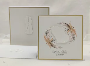 Elegancka, ręcznie wykonana kartka z okazji ślubu w pudełku z ozdobną kopertą na pieniądze lub drobny upominek. Produkt z naszej limitowanej kolekcji WEDDING CHARM, linia BOHEMIAN. Kolekcja WEDDING CHARM ...