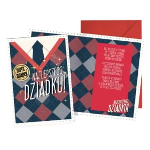 Cechy szczególne wielkość B6, 16. 6 x 11. 7 cm po złożeniu, koperta dopasowana w zestawie, zdobienia przynajmniej dwa rodzaje, często więcej - złota, srebrna lub perłowa folia, tłoczenia, wnętrze kartki kolorowe, z życzeniami, okazja Dzień Dziadka