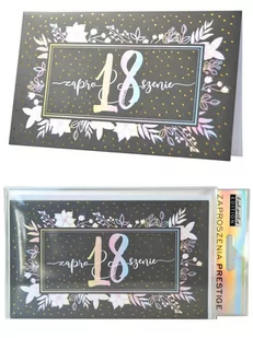 zaproszenie na osiemnastkę zdobienia: doklejane elementy dekoracyjne, tłoczenie przestrzenne, przynajmniej dwa uszlachetnienia z folii lub brokatu, orientacyjna wielkość: 16,5 x 10 cm w opakowaniu: 5 sztuk zaproszeń z dopasowanymi kopertami, okazja: urodziny.