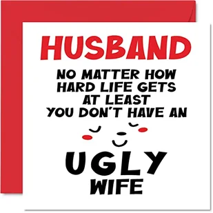 Śmieszne kartki rocznicowe dla męża - Brzydka żona - żart kartka urodzinowa dla męża od żony partnera, prezenty urodzinowe męża, 145 mm x 145 mm ślub walentynki kartki z życzeniami