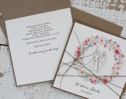 Kartka ręcznie robiona z okazji ślubu. Wymiary 14x14 cm w zestawie z kopertą. Kartka wykonana z najwyższej jakości starannie dobranych materiałów i dodatków - papieru bawełnianego ekologicznego 100% bawełny wraz z ozdobną tekturką. Personalizacja za dopłatą.