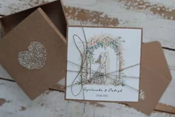 Kartka ręcznie robiona z okazji ślubu. Wymiary 14x14 cm w zestawie z pudełkiem i kopertą na pieniądze z napisem na dobry początek. Kartka wykonana z najwyższej jakości starannie dobranych materiałów i dodatków - papieru bawełnianego ekologicznego 100% bawełny wraz z ozdobną tekturką. Pudełko o wymiarach 15x15x2,5cmPersonalizacja w środku oraz na zewnątrz w cenie. Dane do personalizacji proszę o umieszczenie w uwagach do zamówienia - (imiona, data, życzenia, podpisy).