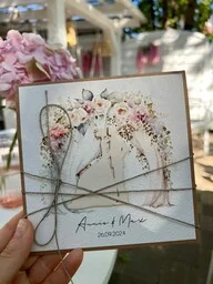 Kartka ślubna z personalizacją w zestawie z kopertą. Kartka o wymiarach 14x14cmPełna personalizacja. Przy zamówieniu proszę o podanie danych: imiona Państwa Młodych, data ślubu, życzenia podpisy (cały tekst, który ma być nadrukowany w środku). Stopień nadruku grafiki może być nieznacznie jaśniejszy od widocznego na zdjęciu.