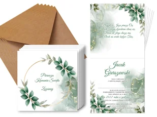 Zaproszenie personalizowane na I Komunię Świętą w motywie delikatnych zielonych liści.