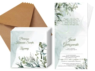 Zaproszenie personalizowane na I Komunię Świętą w motywie delikatnych zielonych liści.