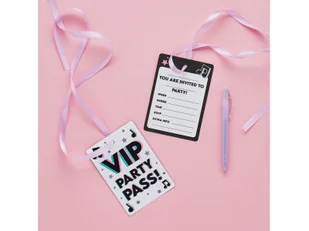 Zaproszenia urodzinowe w formie przepustki VIP z wstążeczką do powieszenia na szyi. Idealny produkt na urodziny w motywie muzycznym lub tanecznym. Pasują do zestawu Let's Dance, który nawiązuje swoim motywem do Tiktok'a. Opakowanie: 10 szt.