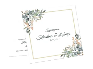 Zaproszenia personalizowane na ślub w motywie z zielonymi listkami i ramką.