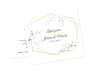 Zaproszenia personalizowane na ślub w motywie z zielonymi listkami i złotą ramką.