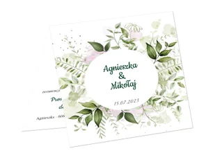 Zaproszenia personalizowane na ślub w motywie z zielonymi listkami i kwiatkami.