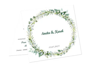 Zaproszenia personalizowane na ślub w motywie z zielonymi listkami i kwiatkami.