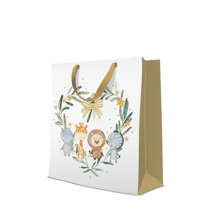 Torba prezentowa Happy Friends large rozmiar po rozłożeniu: 33,5x26,5x13 cm jakość premium, 190 gsm materiał wykonania - papier kolor biały z delikatnym wzorem serca z liści eukaliptusa, główny motyw - uśmiechnięte zwierzątka, kolor wykończenia - złoty