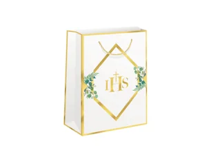 Torebka prezentowa z nadrukiem gałązek eukaliptusa i złotym napisem IHS, idealna na prezenty komunijne.